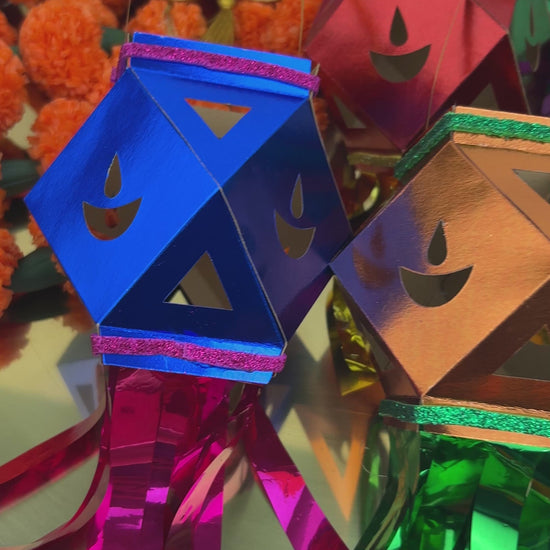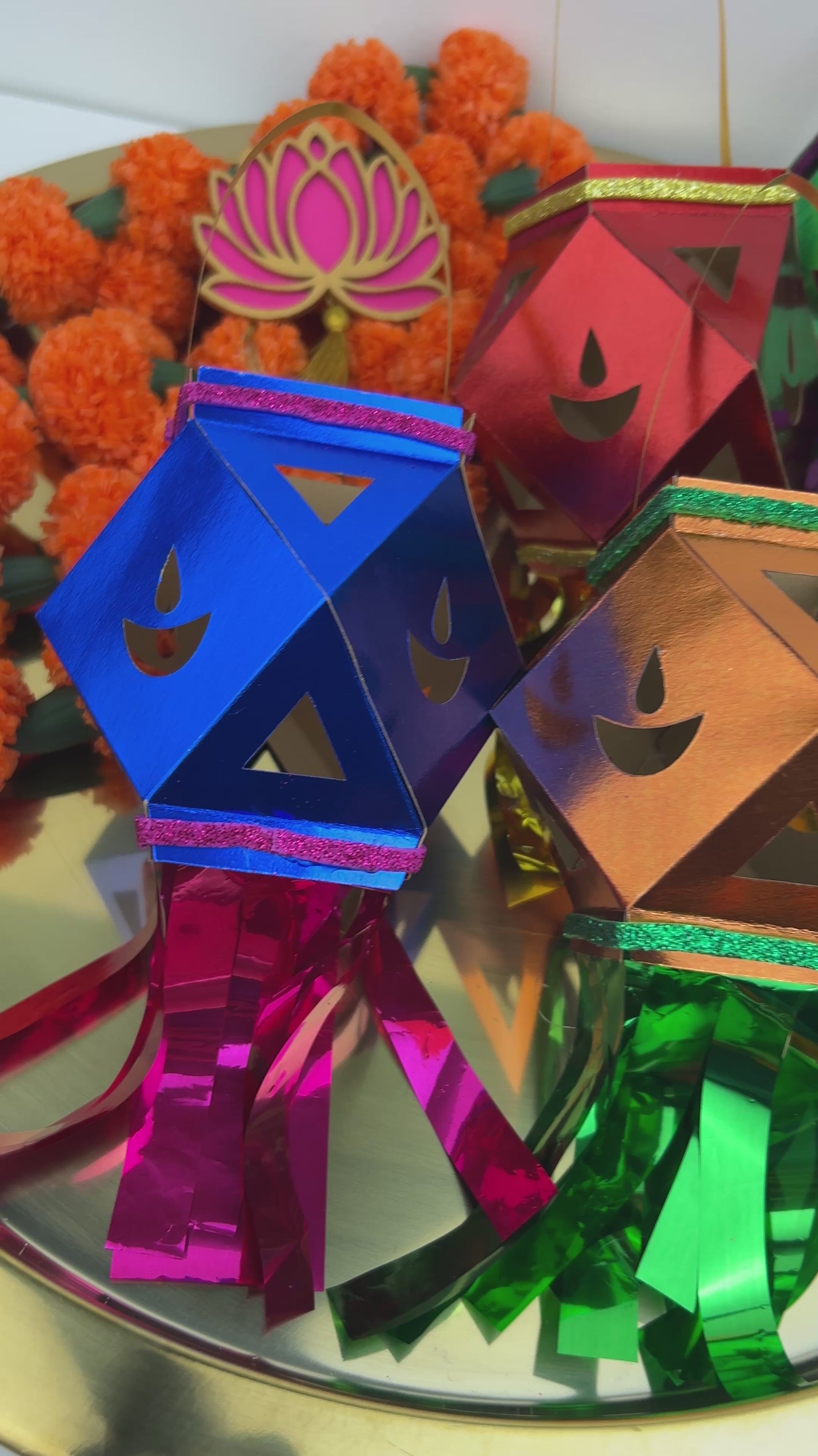 Celebrate Diwali in style with this Royal set of 5 mini lanterns in vibrant festive colors. Each lantern comes pre-assembled and ready to hang, making it quick and effortless to decorate your home.