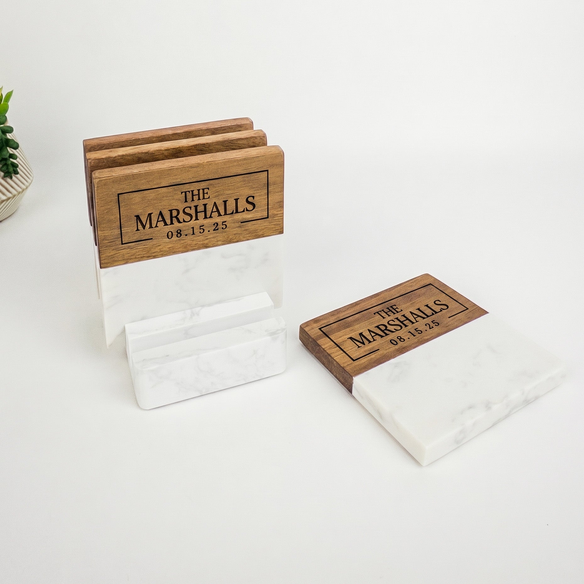A perfect blend of natural acacia wood and marble, this elegant coaster set adds style to any home. Each piece can be custom engraved for a personal touch and comes with a sleek stand for easy storage.